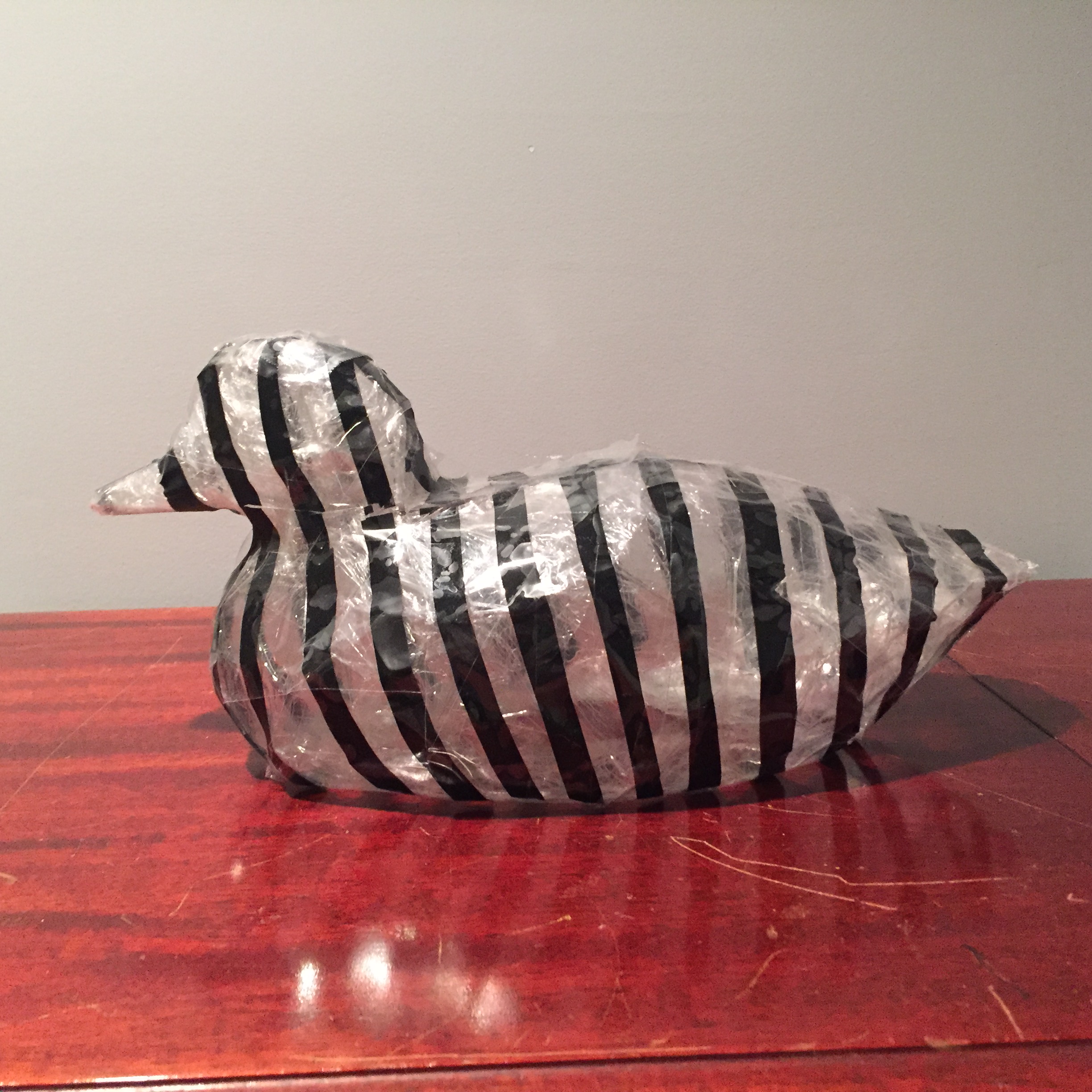The holidays provided lots of duck-making supplies. I made duck 21 out of tissue paper that was once gift wrapping. The pattern on the paper reminded me of waves, so I added a tentacled creature to it. On the other side is a shark and a sting ray.
