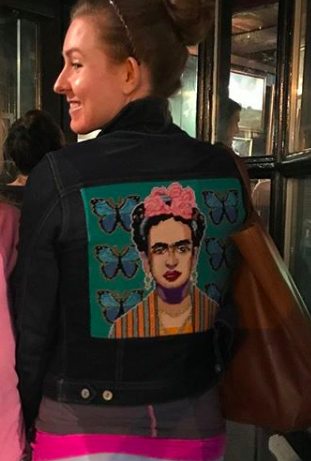 Caroline Lind won gold medals in rowing at the 2008 and 2012 Olympics. She is also a needlepointer and Frida fan. She created an amazing Frida Kahlo jean jacket. I asked Caroline if I could feature her here to drum up enthusiasm for this project and she generously agreed.